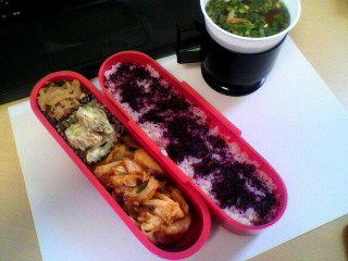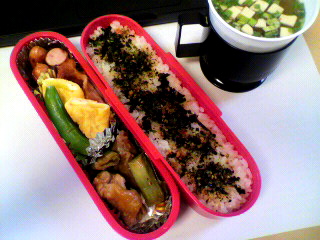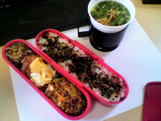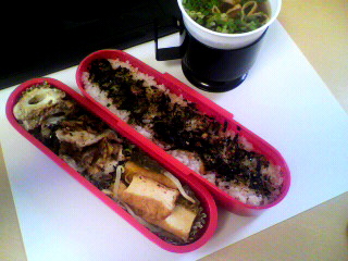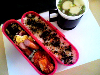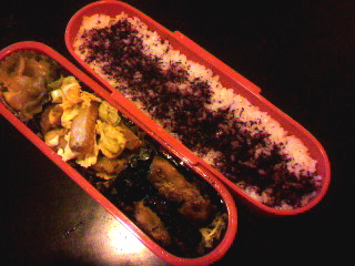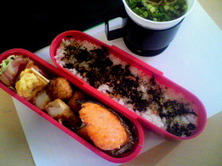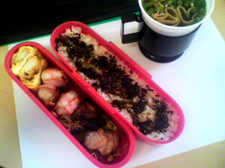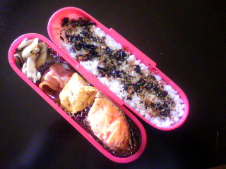 なかったので、朝、お弁当に入れられそうなものを冷蔵庫から発掘して詰めて、